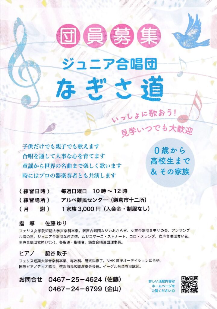 団の紹介:‟ジュニア合唱団なぎさ道”は、高校生までの子ども達と、その家族で構成されている合唱団です。現在、2歳から?歳まで、毎週日曜日、みんなで子育てしながら楽しく歌っています。子どもひとりでも、家族一緒でも参加できます。